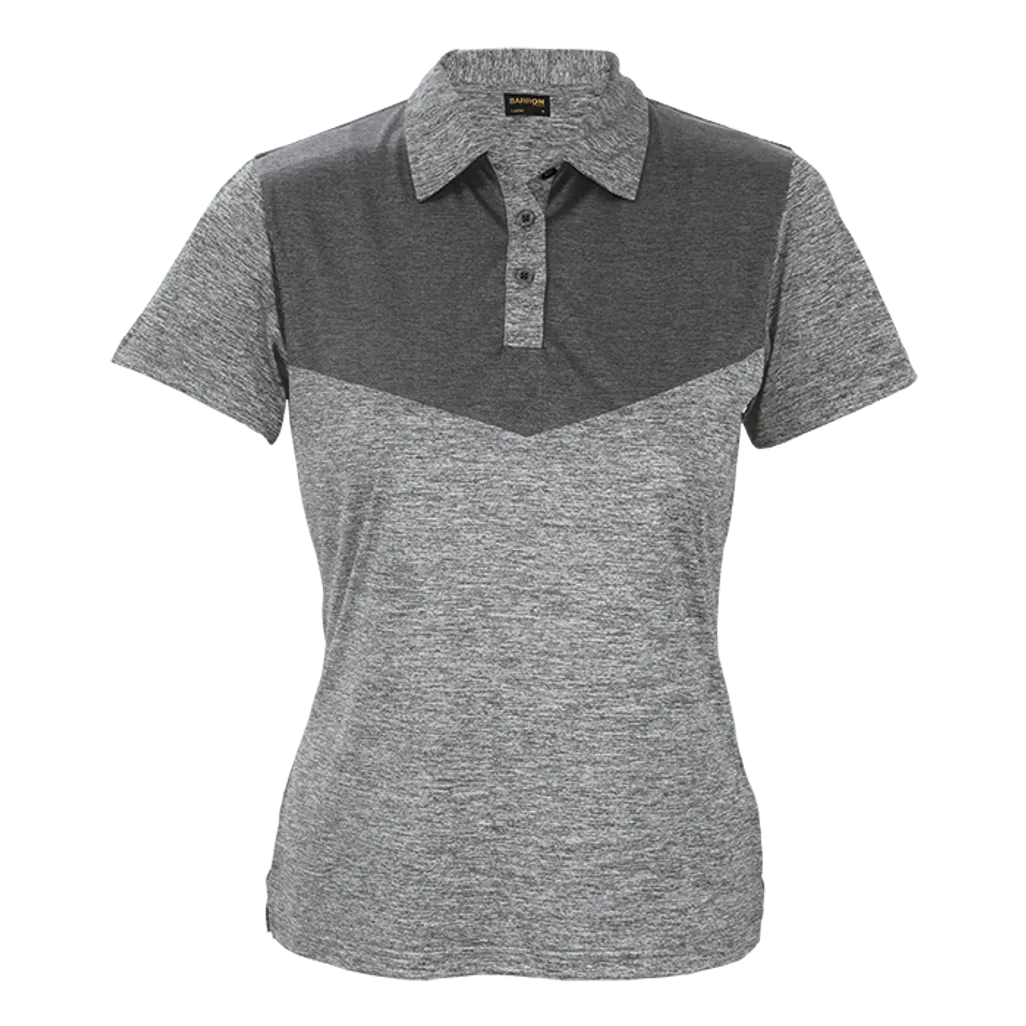 Self fabric one piece collar, Constructed three button placket, Self fabric inner back neck tape, Modern grindle melange fabric design, Fitted sleeves with double stitched hem, Side slits with bartacks for durability, Eye-catching sublimated overprint on front, 160g 100% Polyester Moisture Management Grindle Yarn
