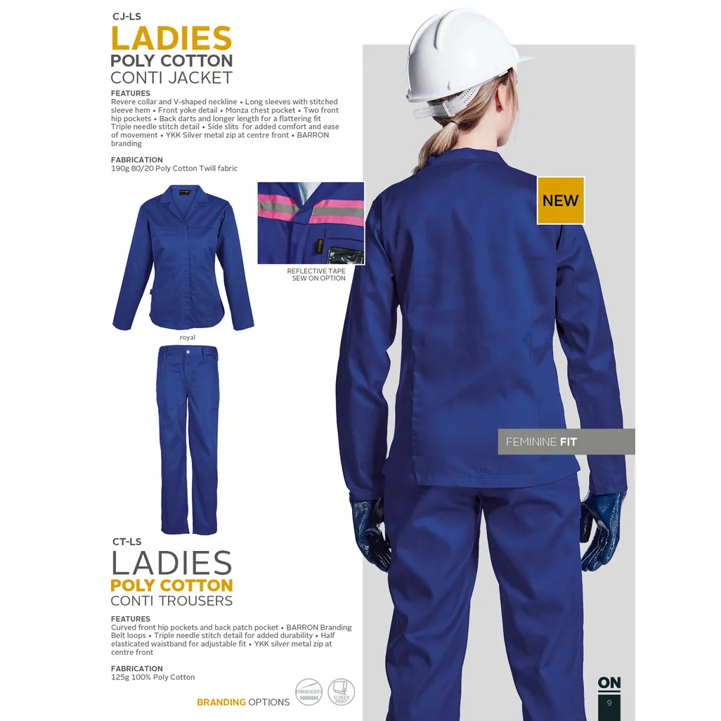 SADC, Front yoke detail, Monza chest pocket, Two front hip pockets, Triple needle stitch detail, Revere collar and V-shaped neckline, 190g 80/20 Poly Cotton Twill fabric, Long sleeves with stitched sleeve hem, Back darts and longer length for a flattering fit, Side slits for added comfort and ease of movement, Silver metal zips at centre front closure and inner pocket
