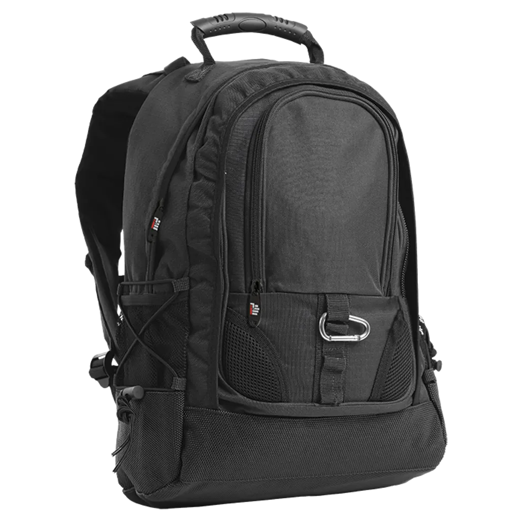 Carabiner clip, Mesh side pockets, Size: 31 x 49 x 16cm, Front zippered pockets, Rubberised carry handle, Elasticated cord pullers, Main zippered compartment, Padded adjustable shoulder straps, Material: 600D Nylon, Dimple rubber base
